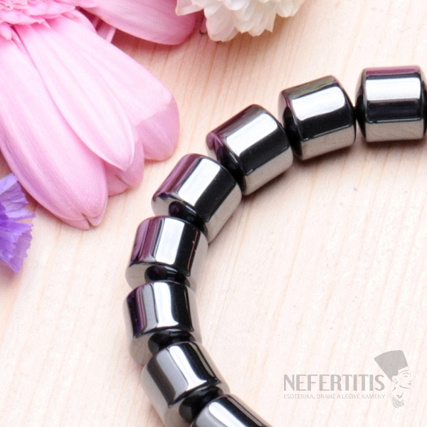 Bracelet made of hematite rollers . The rollers approx. 9.5 x 10 mm are strung on a high-quality black sleeve material. Illustrative representation of natural material, where the color and texture of stone and wood may differ from the accompanying photos. However, you will always receive a bracelet of comparable quality.