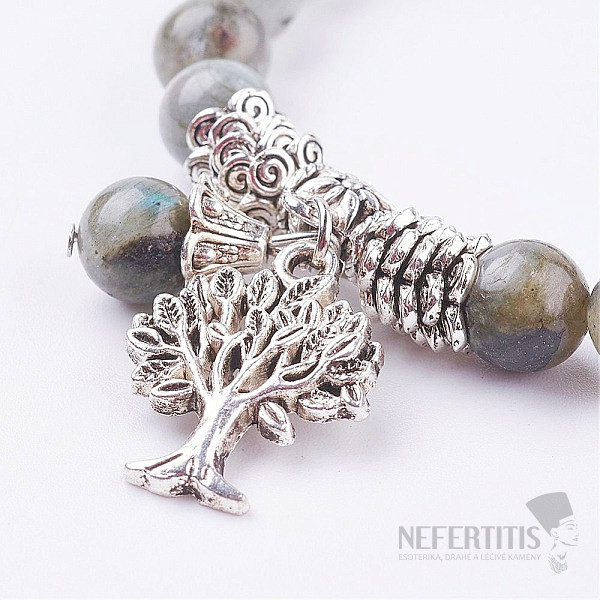 The beautiful bracelet made of natural labradorite beads will enchant you not only with the quality of the stone, but especially with the beauty of the flashes of blue, which will ignite on the surface of the stones under the impact of light. The labradorite protects its owner and, just as the play of colors on its surface ignites, this bracelet brings light into the life of its wearer. The bracelet is complemented by a base metal pendant in the color of faded silver with the symbol of the Tree of Life, which gives its wearer vitality, energy and vitality . Labradorite beads are strung on a high-quality nylon rubber band of neutral color. Bead size approx. 8 mm. The "tree of life" pendant and metal components are made of jewelery metal. Illustrative depiction of natural material, where the color and structure of the stone may differ from the accompanying photographs. However, you will always receive a bracelet of comparable quality.