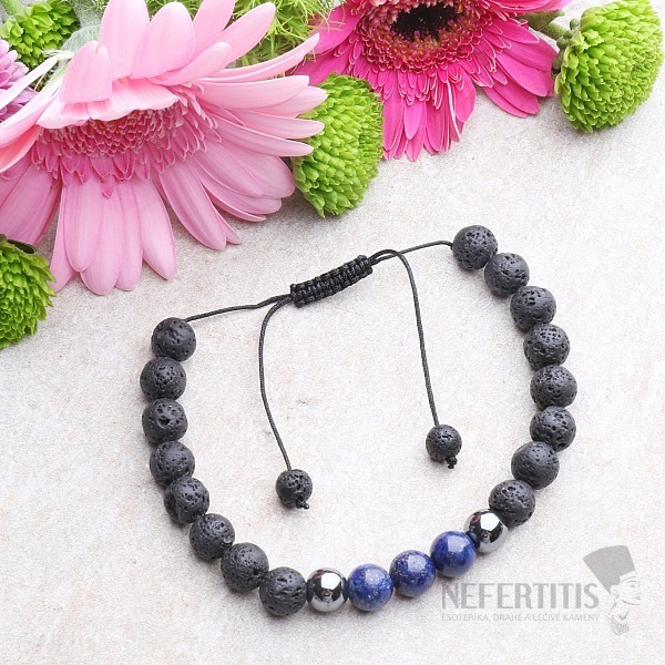 A beautiful bracelet made of natural lapis lazuli, hematite and lava stone beads with lava beads on a Shamballa clasp , brings peace and tranquility to its wearer. The diameter of the beads is 8 mm, the diameter of the lava beads approx. for the clasp is approx. 6 mm, strung on a quality black cotton cord.