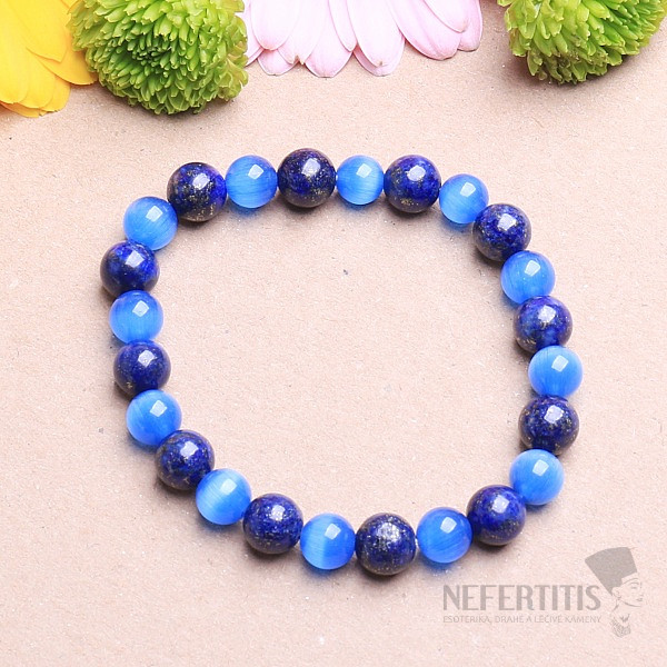Elegant and distinctive bracelet made of deep blue lapis lazuli beads with blue ulexite, with a cat's eye effect. Bead size approx. 8 mm. The beads are strung on a nylon rubber band of neutral color. Illustrative depiction, you are buying natural material, individual bracelets may differ slightly from the accompanying photographs in color shade and stone drawing.
