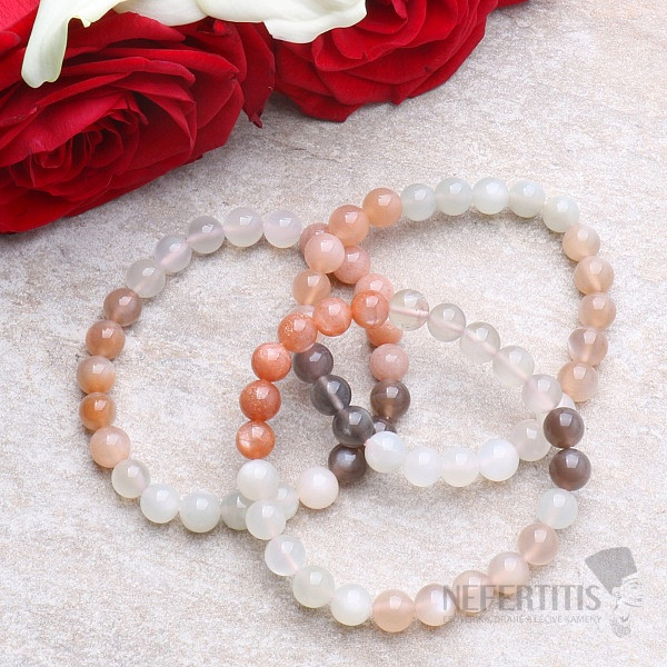 A beautiful bracelet made of natural rainbow moonstone multicolor AA quality carries the energy of the "female goddess", helping women to greatly increase their feelings, encouraging fervent desires, eager anticipation and heartfelt determination. The bracelet is composed of rainbow and various tones of orange moonstone. You will fall in love with this charming, elegant piece of jewelry, on whose rainbow stones flashes of "blue fire" ignite under the influence of light at first sight. The great advantage of this bracelet is its elasticity, which can be stretched up to a circumference of 22 cm. The beads, approximately 8 mm in size, are strung on a high-quality pink nylon elastic band. Illustrative image of a natural material, where the color and structure of the stone may differ from the accompanying photos. However, you will always receive a bracelet of comparable quality.