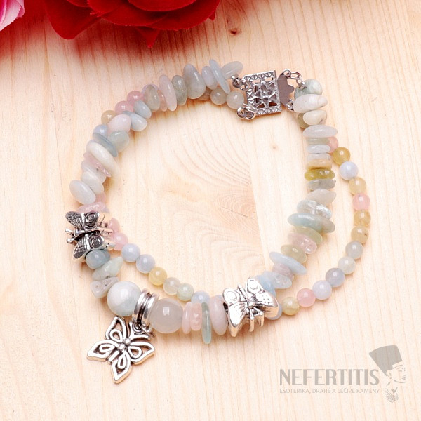 Morganite - beryl pink emerald double bracelet with butterflies 19 cm