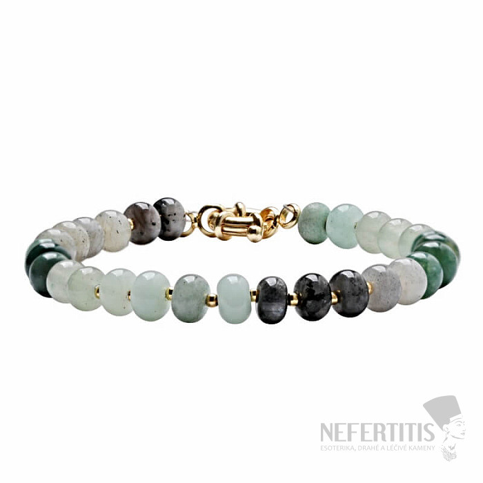 Attractive bracelet with a mix of semi-precious stones - moss agate, green aventurine, jadeite, decorated with metal beads. Treat yourself to a unique piece of jewelry - a bracelet made of a mix of semi-precious stones combines the beauty of nature with elegance and positive energy. The size of the beads is approximately 5.7 to 6.5 mm, the metal beads and the jewelry clasp are made of base metal. Illustrative image, you are buying a natural product, therefore individual bracelets may differ from it, especially in the color shade and pattern of the stone. However, you will always receive a bracelet of comparable quality.