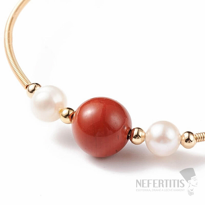 A simple, attractive bracelet made of cultured freshwater pearls combined with red jasper and metal beads. Pearls are a symbol of new life, fertility, new beginnings and endless fulfilled love. A delicate yet distinctive and unmistakable bracelet that will be a very decorative and elegant piece of jewelry at all times of your life, whether for daily wear or even for a wedding. Material: pearls, natural stone, base metal and brass. Illustrative image.