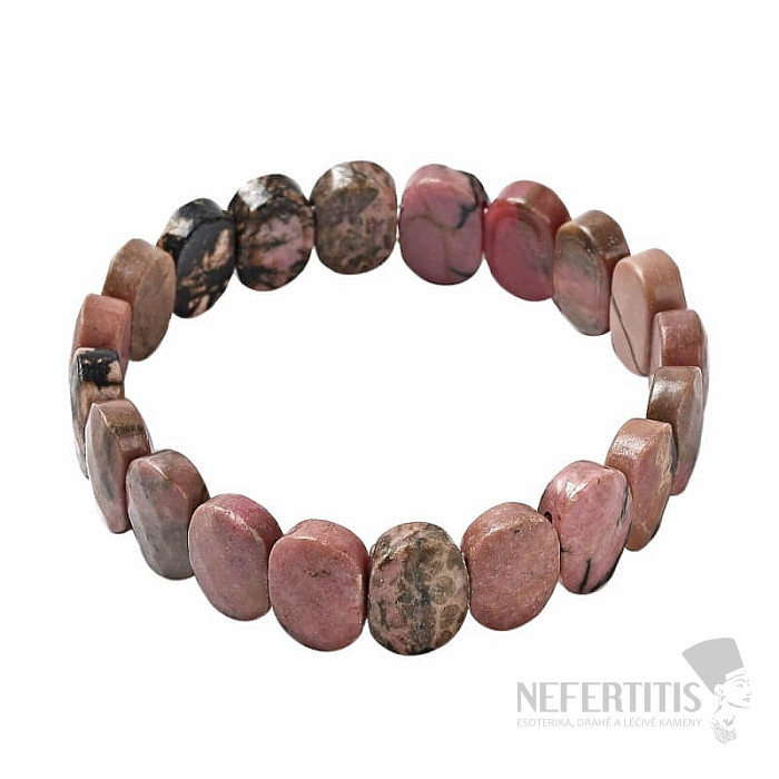 An absolutely extraordinary piece of jewelry for rhodonite lovers is this charming bracelet made of exceptionally beautiful cut rhodonite plates. The faceted cut edges on these stones give the bracelet an exclusive look. The width of the bracelet is approx. 14 mm, the individual plates are strung on two white nylon rubber bands. Illustrative image, you are buying a natural material, therefore the individual bracelets may differ from the accompanying photos in terms of size, color, structure and stone pattern.