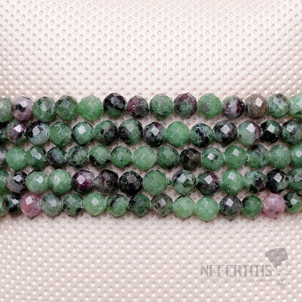 Attractive bracelet made of cut ruby beads in extra quality zoisite. Hundreds of cut surfaces give the bracelet an unmistakable sparkle. The size of the beads is approx. 4 mm, strung on a high-quality green nylon rubber band. Illustrative representation of natural material, where the color and structure of the stone may differ from the accompanying photos. However, you will always receive a bracelet of comparable quality.