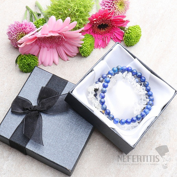 A set of three beautiful bracelets made of natural lapis lazuli beads , sodalite and crystal. Beads of approx. 6 mm, tumbled pieces of crystal are strung on a high-quality, neutral-colored nylon elastic band. The metal beads are made of 304 steel. Supplied in a luxury paper gift box with a bow.