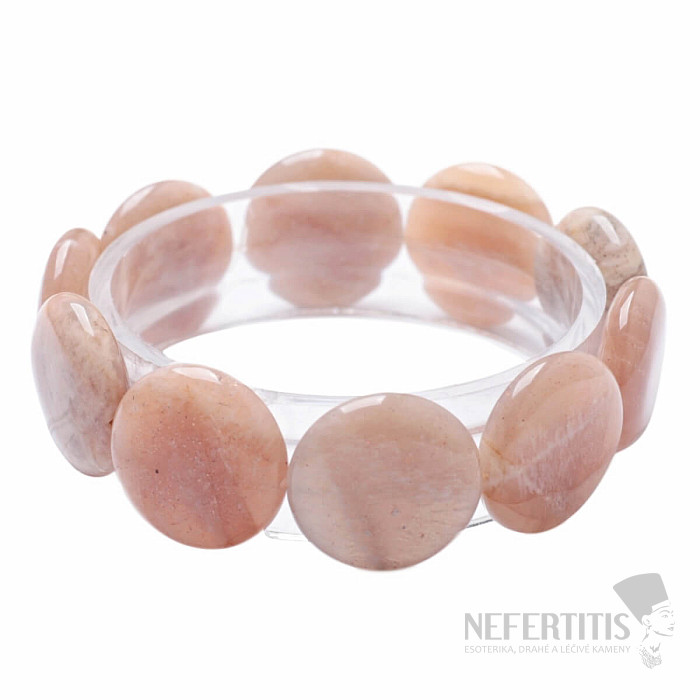 Attractive bracelet made of sunstone disks. The size of the discs is approx. 6 x 20 mm, threaded on a high-quality nylon rubber band of neutral color, glittering applications are made of base metal. Czech handmade.