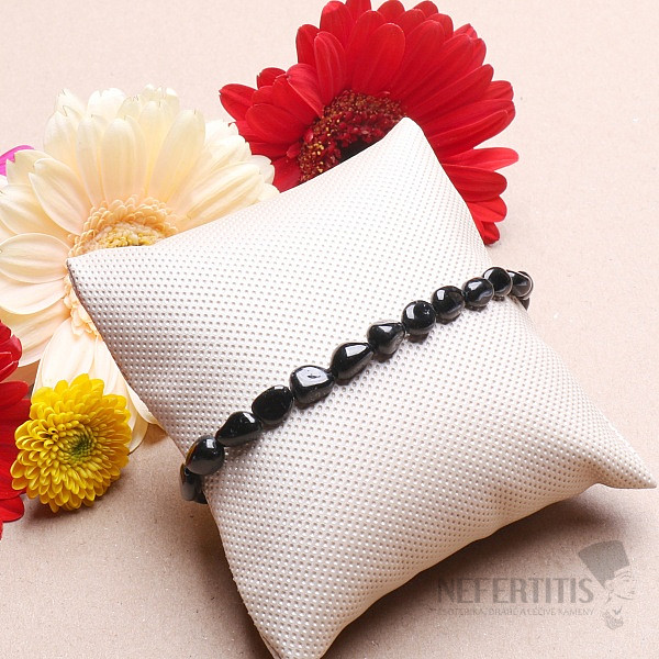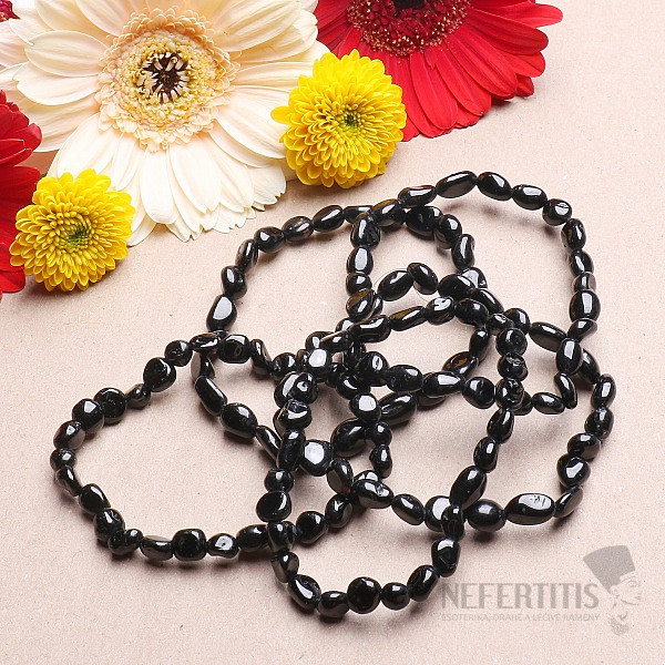 Attractive and elegant bracelet made of polished oval stones of black tourmaline skoryl removes stress, anger, fear and negativity. Increases self-confidence of its wearer. A distinctive and unique piece of jewelry, charming at first glance with its deep black color. Stone size approx. 5-6 mm, strung on a quality black nylon rubber band.