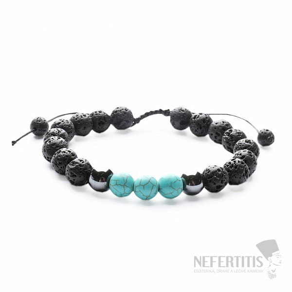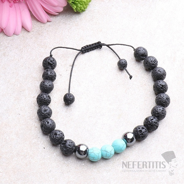 A beautiful bracelet made of tyrkenite (reconstructed turquoise) , hematite and lava stone beads with lava beads on a Shamballa clasp . The size of the beads is 8 mm, the diameter of the lava beads approx. for the fastening is approx. 6 mm, strung on a quality black cotton cord. Illustrative representation of natural material, where the color and structure of the stone may differ from the accompanying photos. However, you will always receive a bracelet of comparable quality.
