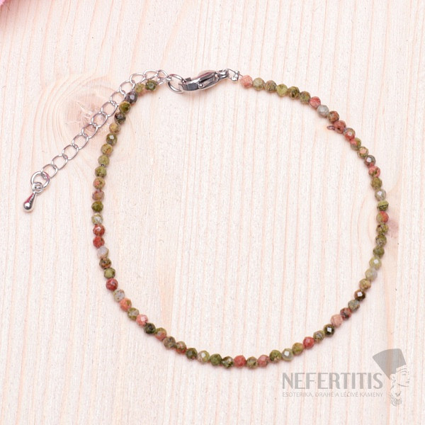 Bracelet made of cut unakite beads. Thanks to hundreds of cut surfaces, the bracelet glitters beautifully and is the perfect accessory for various occasions. Bead size approx. 2 mm, jewelery fastening made of stainless steel, chain made of base metal. Illustrative illustration.