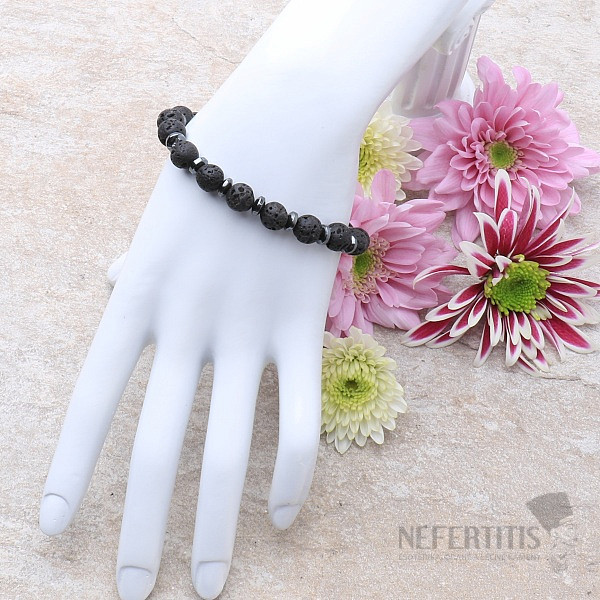 There is beauty in simplicity. Elegant lava stone bead bracelet with shiny black metal beads. Among the lava stone beads are embedded metal spikes, whose shiny metallic color gives the bracelet shine and "sparkle". An attractive and unmissable bracelet with an elegant contrast of matte black and shiny metallic colors. Diameter of lava stone beads approx. 8 mm. The beads are strung on a high-quality, neutral colored nylon elastic band.