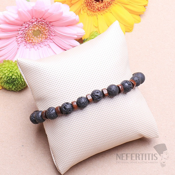 An elegant bracelet made of natural lava stone beads. An attractive and unmissable bracelet. Incorporated into the bracelet is a metal bead made of base metal with the Om symbol, with strong protective and cleansing power, which, according to rumors, brings inner strength to its wearer. The bracelet is decorated with wooden rings. The size of the lava beads is approx. 8 - 8.5 cm. The beads are strung on a neutral colored nylon elastic band. Illustrative image.