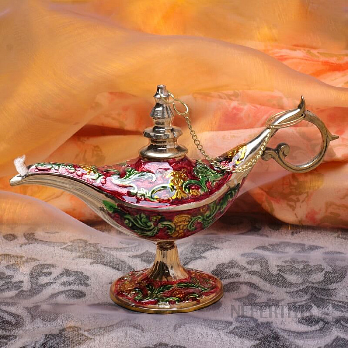 Attractive oil decorated Aladdin lamp from 1000 and one night. A beautiful decoration, a helper for meditation, moments of relaxation and aromatherapy. The lamp is made of brass, the ornaments are covered with a resin layer. Dimensions: approx. 18 x 13 cm (width x height). Illustrative image.
