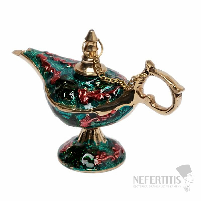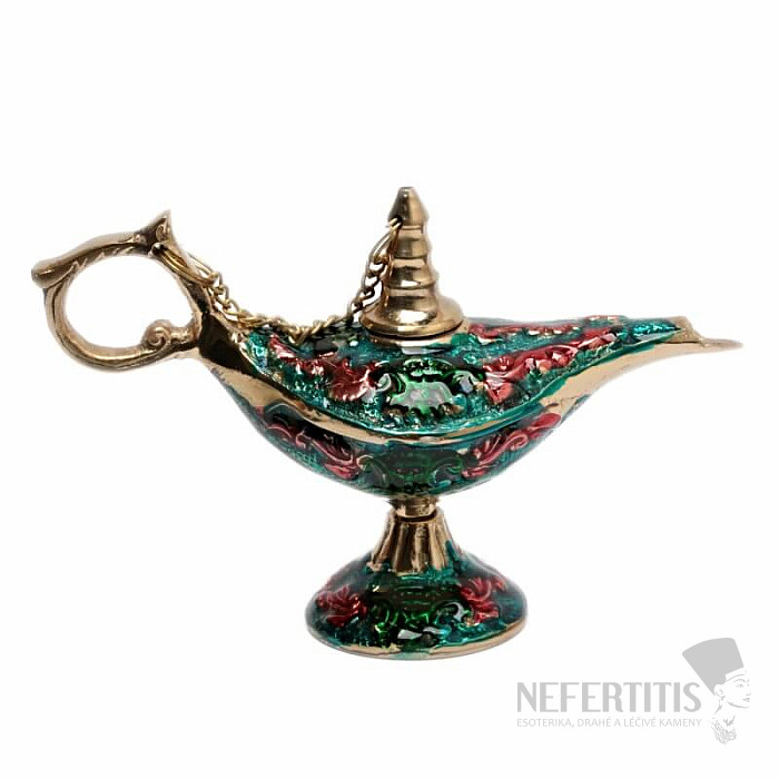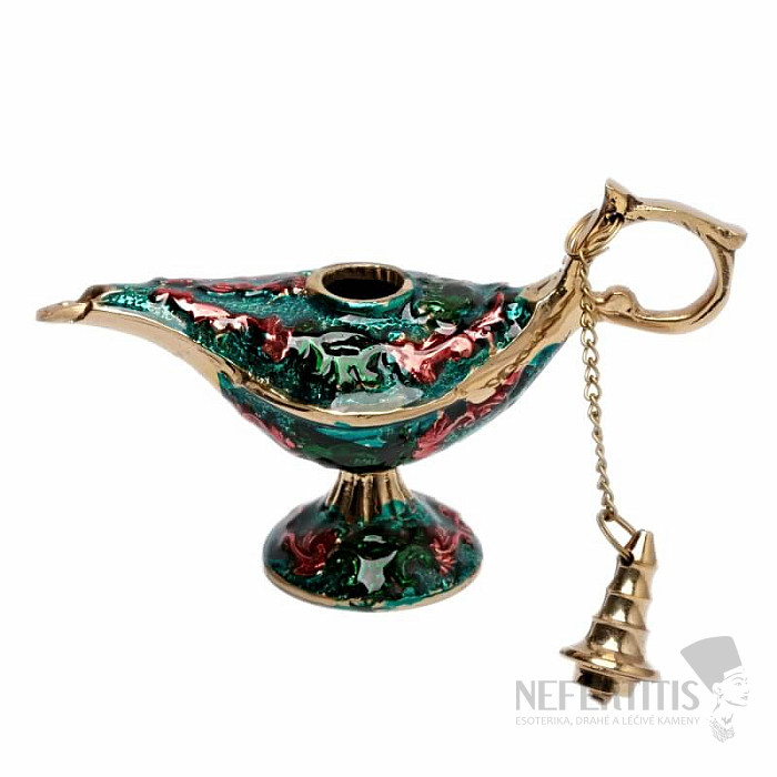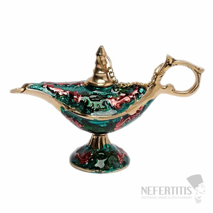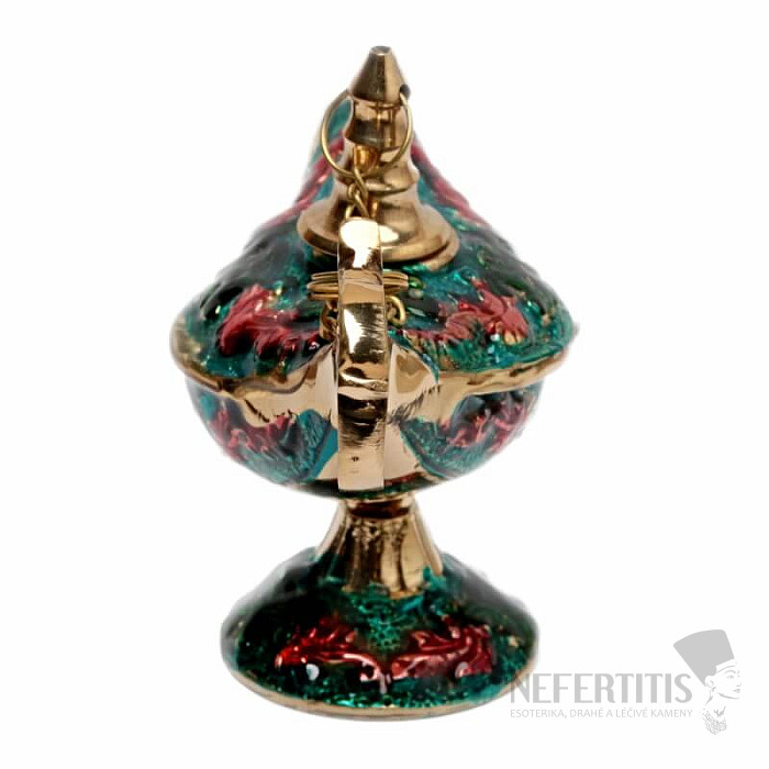 Attractive oil decorated Aladdin lamp from the fairy tales of 1000 and one nights. Beautiful decoration, an assistant for meditation, moments of relaxation and aromatherapy. The lamp is made of brass, ornaments and colored enamel. Dimensions: approx. 17 x 8 cm (width x height). Illustrative image.