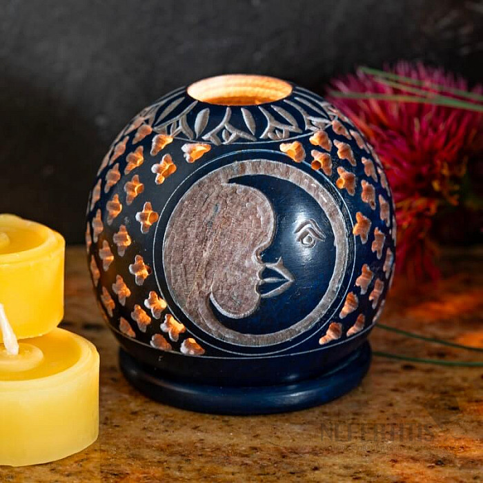 Decorative candle holder made of talc for tea candles Blue Moon. Attractive home decoration for the apartment and office. Treat yourself to moments of well-being with a candle flame at home, in the winter garden and on summer days outside in the garden. The size is approx. 7 x 7 cm. Illustrative image.