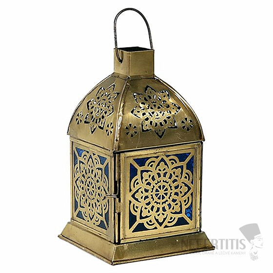 Metal candle holder Mandala for tea lights. The size is approx. 9 x 9 x 15.5 cm. Material: iron and glass with indigo color, which personifies wisdom , truth, dignity and spiritual mastery. Indigo is a soft color ray, intended for looking into the past, it is the color of virtue and maturity.