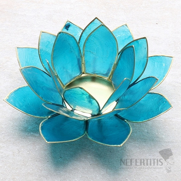 A light blue (turquoise) lotus flower shaped tea light candle for the throat chakra. The turquoise/light blue color symbolizes balance, emotional stability, harmony and peace. The lotus flower symbolizes the change of darkness into light, the change of ignorance into knowledge. Turquoise/light blue is the color of the neck chakra (throat chakra) – Vishuddha. The candlestick is made from oyster shells (placuna placenta), also known as capiz shells after the place where the oysters are collected, i.e. around Panay City, Capiz Province, Philippines. After cleaning, the shells are naturally translucent, and when dyed they allow a wonderful interplay of colors and light.