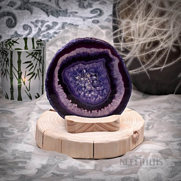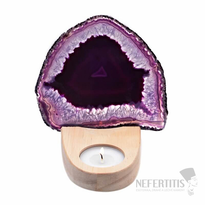 Tealight holder made of a slice of purple agate. Supplied with a wooden base with a milled hole for the candle, located behind the slice. Each slice is original, therefore the color, shape and size may differ from the sample shown. Country of origin: Brazil