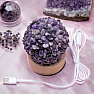 A beautiful table USB lamp with pieces of tumbled amethyst is literally a magical decoration for an apartment or office. The lamp with a wooden base and a light ball, sprinkled with dozens of pieces of deep purple natural amethyst, can be easily connected to a computer or a charging adapter for mobile phones via a classic USB socket. Light source: LED diode. The height of the lamp approx. 10 cm, the diameter of the ball with amethysts approx. 10 cm. Illustrative depiction of the product with natural material, the size, shape and color of the amethyst stones may differ from the accompanying photos.