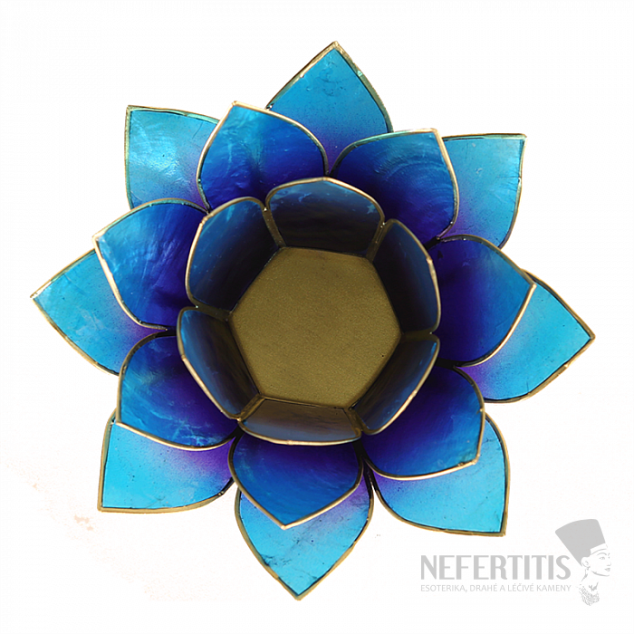Blue-violet candlestick in the shape of a lotus flower on a tea candle. The blue color symbolizes sincerity, responsibility, loyalty and trust. The lotus flower symbolizes the change of darkness into light, the change of ignorance in cognition. After cleaning, the shells are naturally translucent and colored then allow a wonderful interplay of colors and light.