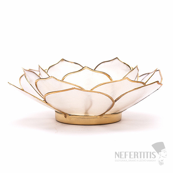White candlestick in the shape of an open lotus flower on a tealight. White color purity, unity and innocence. The lotus flower symbolizes the change of darkness into light, the change of ignorance in cognition. After cleaning, the shells are naturally translucent and colored then allow a wonderful interplay of colors and light.