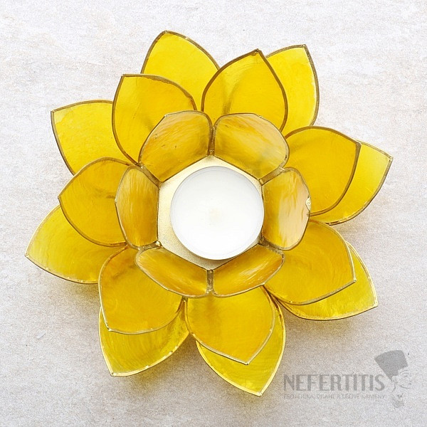 A bright yellow tea light candle in the shape of a lotus flower for the solar plexus chakra. The bright yellow color symbolizes optimism, enlightenment, warmth and clarity. The lotus flower symbolizes the change of darkness into light, the change of ignorance into knowledge. Bright yellow is the color of the solar plexus chakra - Manipura. The candlestick is made from oyster shells (placuna placenta), also known as capiz shells after the place where the oysters are collected, i.e. around Panay City, Capiz Province, Philippines. After cleaning, the shells are naturally translucent, and when dyed they allow a wonderful interplay of colors and light.