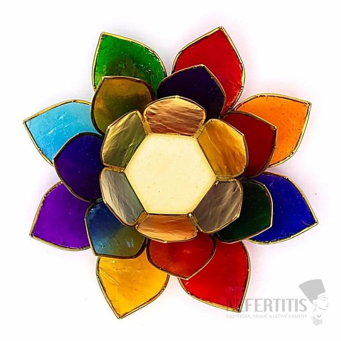 Chakra candle holder in the shape of a lotus for harmonizing the 7 chakras. The candle holder is made of oyster shells (placuna placenta), also known as capiz shells after the place where the oysters are collected, i.e. around Panay city, Capiz province, Philippines. After cleaning, the shells are naturally translucent and then dyed, allowing for a beautiful interplay of colors and light.