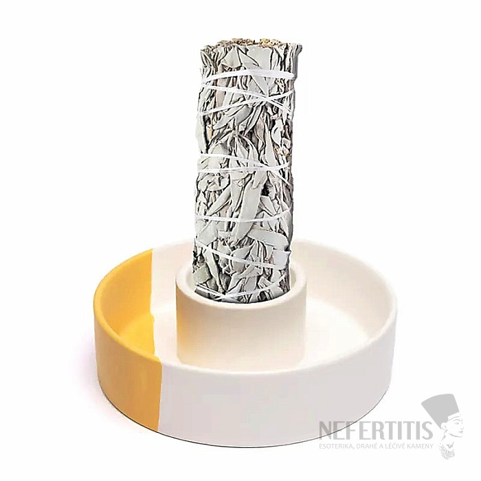 This round yellow-ochre ceramic stand is a handmade and durable tool designed specifically for the safe burning of smoking bundles. It is made of high-quality ceramics fired at high temperatures, which ensures high heat resistance, strength and long life. The stand has an elegant round shape and easily catches the remains of burning herbs. The yellow-ochre glaze gives it a natural, warm and earthy character. Each piece is original - slight variations in shade, structure and pattern are the result of honest handwork. Material: ceramic. Illustrative image.