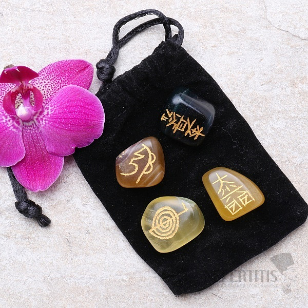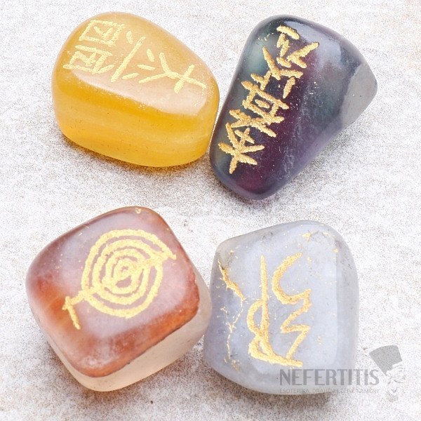 Basic reiki set of smoothed multicolored fluorite stones with four main Reiki symbols for strong and free-flowing energy to harmonize the mind and body. Reiki is a life energy that goes through all living things. Ki, or the energy of the individual, should be strong and free flowing. Then the body and mind are fine. When energy is lost or blocked, it can lead to mental or physical imbalance. The set contains 4 stones of natural lapis lazuli with four main Reiki symbols , each of which affects specific areas of our lives, minds and bodies. The set of stones is suitable for anyone who wants to start using the healing Reiki energy. The approximately 2.5 cm large smoothed fluorite stones with hand-engraved Reiki symbols are usually smoothed so that they have at least one flat surface and are well applied to the individual places to be treated with healing Reiki energy . The stones are pleasant to hold between your fingers, the smooth surface is ideal for moments when you need to soothe stress, if you stroke them with your thumb, they are very pleasant to the touch. A cost-effective set of Reiki stones. Free velvet pouch for storing stones. You will find a description and pictures of the individual symbols in this article .