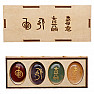 A beautiful reiki gift set of large oval semi-precious stones with four main Reiki symbols in a handmade box for strong and free-flowing energy to harmonize the mind and body. Reiki is a life energy that goes through all living things. Ki, or the energy of the individual, should be strong and free flowing. Then the body and mind are fine. When energy is lost or blocked, it can lead to mental or physical imbalance. The set contains 4 precious stones with four main Reiki symbols , each of which affects specific areas of our lives, mind and body - green aventurine with a master symbol , red jasper with a symbol of strength , purple amethyst with a symbol of emotional relief and yellow aventurine with a symbol remote healing. The set of stones is suitable for anyone who wants to start using the healing Reiki energy. Approx. 3.8 cm large oval stones with hand-engraved Reiki symbols are smoothed so that they have a flat surface on the underside and fit well to the individual places to be treated with healing Reiki energy . The stones are pleasant to hold between your fingers, the smooth surface is ideal for moments when you need to soothe stress, if you stroke them with your thumb, they are very pleasant to the touch. Dimensions of the gift box approx. 15 x 7 x 2 cm.