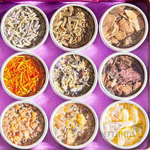 A set of incinerators made of herbs, wood, resins, roots and nuts to relax the mind, suppress tension and create an overall harmonizing atmosphere. The set contains 12 different smoke extractors. Total weight of fumes approx. 30 g, total package weight approx. 150 g.
