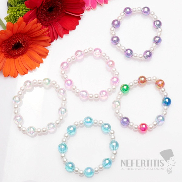 A playful children's bracelet made of colored beads with the Aqua aura effect with acrylic beads. The bracelet is a fashion accessory for various occasions, such as a children's party, theater, but also just for fun -… more »