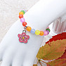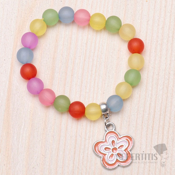 Cheerful children's bracelet made of colored acrylic beads with a metal enamel flower in several color variants. Bead size approx. 8 mm, circumference approx. 14 cm in the unstretched state. Flower size approx. 1.9 cm, pendant length approx. 3.2 cm.