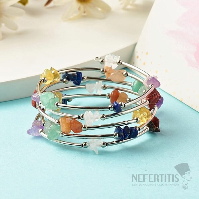 An excellent five-row bracelet made of steel and pieces of semi-precious stones in the colors of the chakras. Show your feelings with this elegant and attractive wrap bracelet. A combination of pieces of semi-precious stones, embedded together with small steel beads between the silvery metal. Illustrative image, buy natural material, individual bracelets may differ from accompanying photos in size, color shade and shape and color composition of stones. However, you will always receive a bracelet of comparable quality.