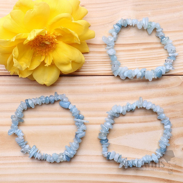 The azure color of the ocean is the characteristic of that beautiful bracelet of tumbled pieces of quality aquamarine . The magic blue bracelet evokes feelings of a bright blue day, full of joy, happiness and optimism. Threaded on a white rubber band.