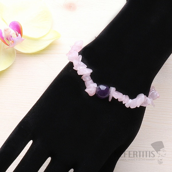 A charming, charming at first glance, yet very attractive bracelet in a beautiful and energetically powerful combination of two perhaps the most popular stones - pieces of rose gold and a purple amethyst bead. Stones with a bead are strung on an elastic nylon sleeve of a neutral color.