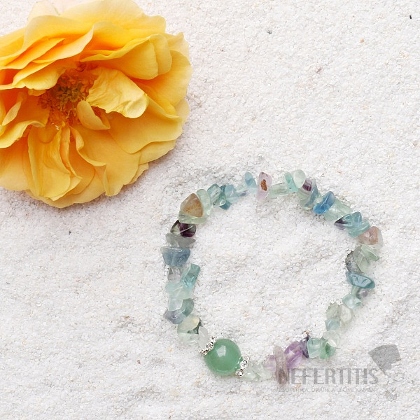 A beautiful bracelet made of chopped, tumbled pieces of extra-quality fluorite, complemented by a large aventurine bead, is said to be a bracelet of strong protection for its wearer. Fluorite is said to bring truth, protection, relieve stress and anxiety, and support the mind and body. The aventurine bead is said to banish fear, depression and sadness, and also has a protective power. If you want something more expressive than the "regular" chopped bracelets, then this attractive bracelet may be the right choice. Threaded on a quality nylon elastic band.