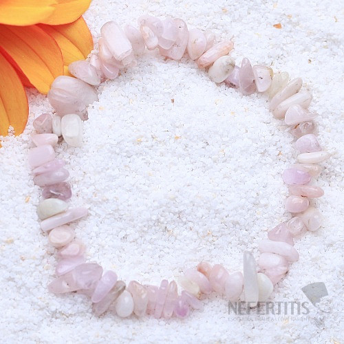 Bracelet made of chopped, tumbled pieces of kunzite, strung on an elastic band. Kunzit is a stone of calm and high vibrations. It helps to express oneself freely, cleanses old emotions, improves mood during periods of… more »