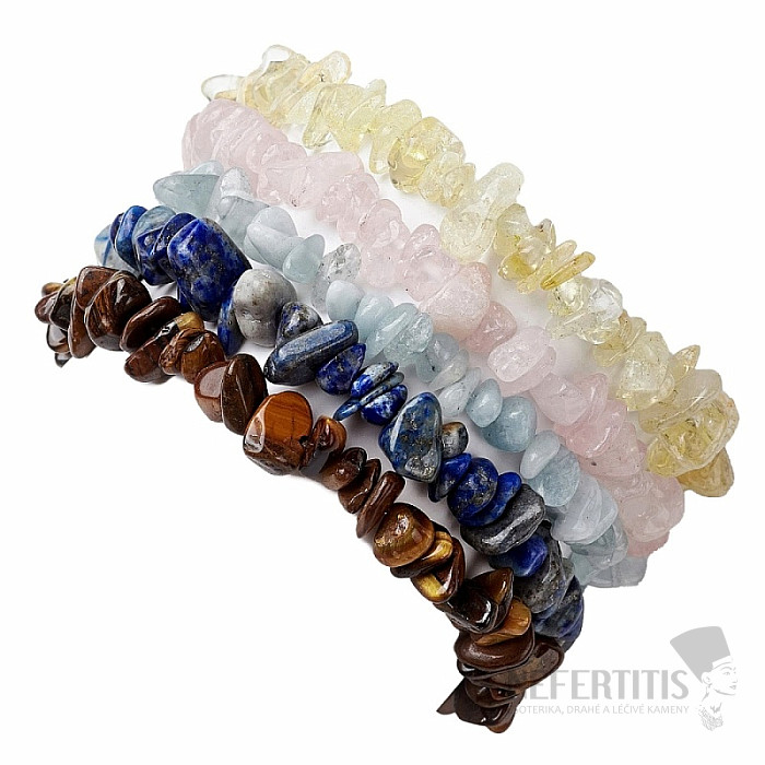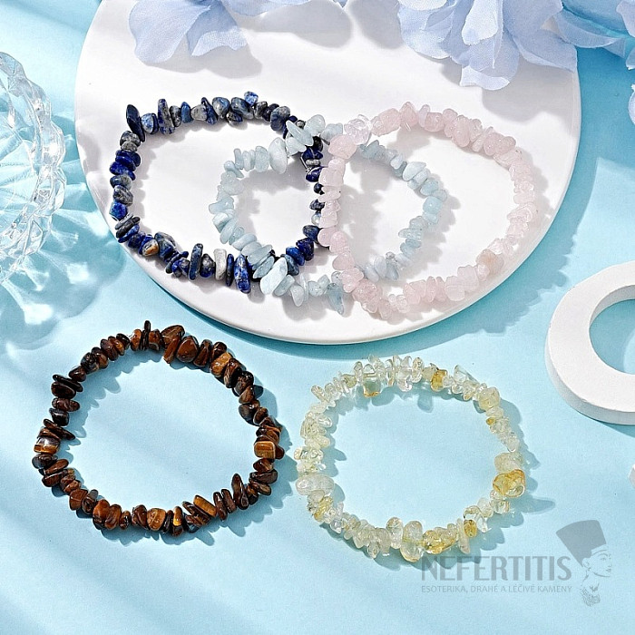 A set of five bracelets made of cut polished pieces of gemstones - aquamarine, lapis lazuli, citrine, rose quartz and tiger's eye. Affordable set. Treat yourself to a combination of bracelets made of your favorite stones. Stringed on a high-quality, neutral-colored nylon elastic band. Illustrative depiction of the natural material, color, shape and size of the stones may differ from the accompanying photos.