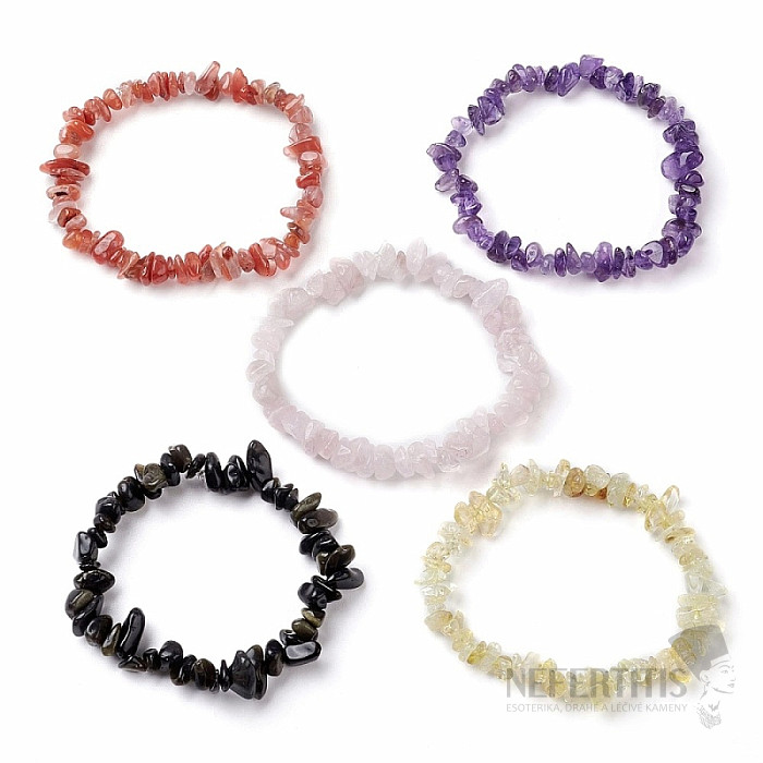A set of five bracelets made of cut polished pieces of gemstones - agate, citrine, rose quartz, amethyst and obsidian. Affordable set. Treat yourself to a combination of bracelets made of your favorite stones. Stringed on a quality nylon rubber band of a neutral color. Illustrative depiction of the natural material, color, shape and size of the stones may differ from the accompanying photos.
