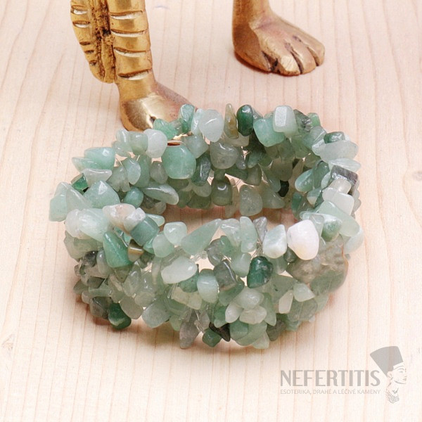 A wide bracelet made of chopped, tumbled pieces of green aventurine , supposedly brings happiness and endurance to its wearer. Bracelet width approx. 2.5 - 3 cm. Pieces of aventurine strung on nylon rubber bands of neutral color.