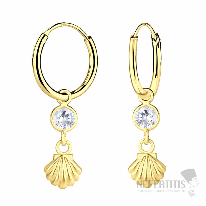 Timeless gold-plated silver earrings with zircon, 2.5 cm long, stand out with their original design, which consists of a circle with a diameter of 1.2 cm and a thickness of 1.2 mm with a shell-shaped pendant. The shell generally symbolizes protection, femininity/fertility, birth and journey. The earrings are huggie type. Huggie earrings are small circular earrings that tightly surround the earlobe and, thanks to the snap-on ring (hinge) closure, are comfortable to wear all day long.