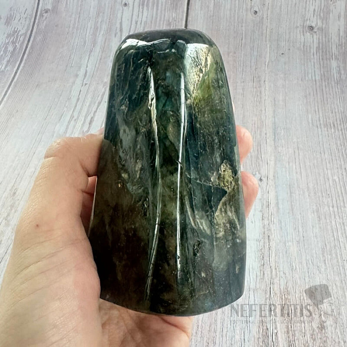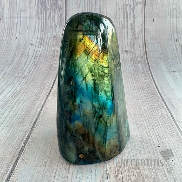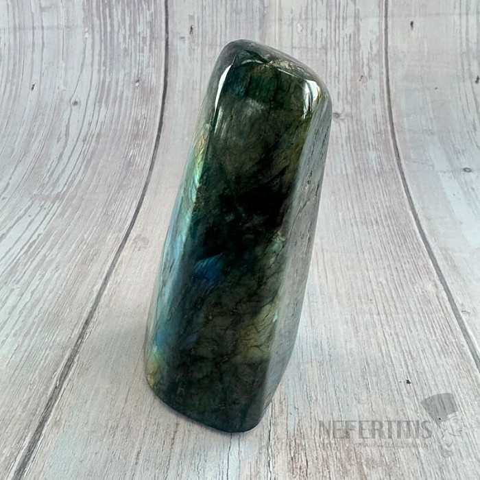 A beautiful, free-form, hand-polished iridescent labradorite with a striking play of colors that magically glows bright blue when the light hits it. Decorative freeform in premium quality.