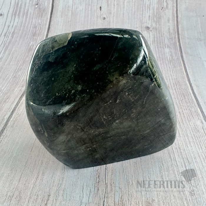 A beautiful, free-form, hand-polished iridescent labradorite with a striking play of colors that magically glows bright blue when the light hits it. Decorative freeform in premium quality.
