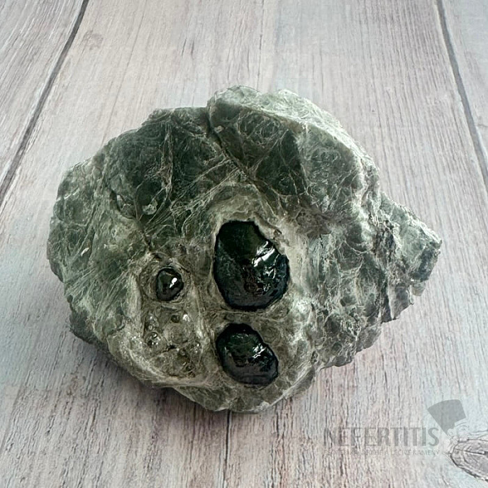 Apache Tear Obsidian in matrix. This type of obsidian is found only in Arizona. Size approx. 8.5 cm, tears approx. 1.7 and 1.3 cm and one small obsidian, 346 g. Country of origin: USA, Arizona You are purchasing the… more »