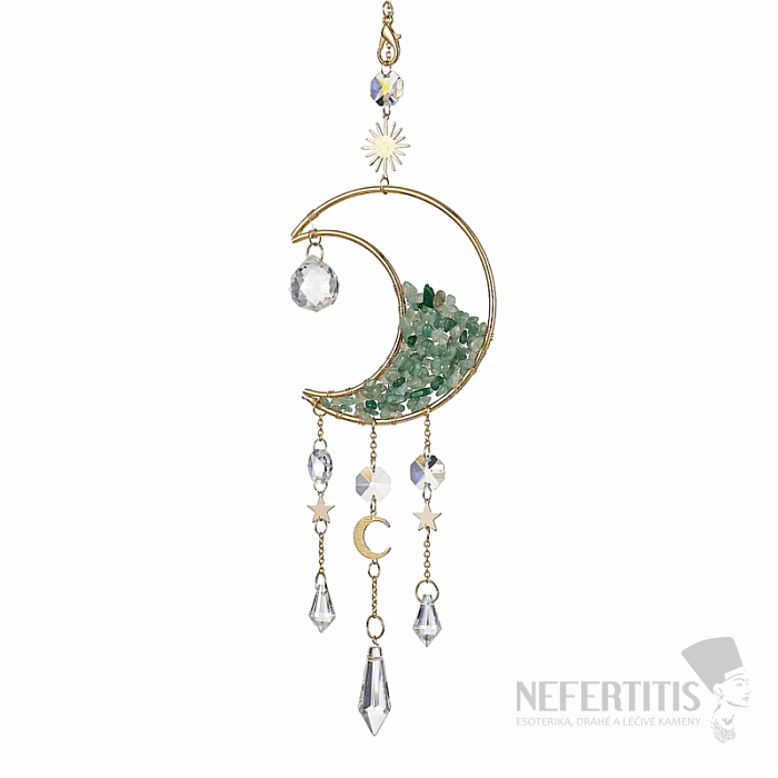 Feng Shui hanging with rainbow crystals Aventurine moon with stars . Aventurine is a stone of happiness and prosperity. The five-pointed star - pentagram is a symbol of protection and luck. The cut glass ornaments are coated with a golden metal, thanks to which their surfaces shimmer in a delicate blue and gold color with shimmering flashes. Hang this decoration best in the window and let the sun shine through the rainbow crystals into your room. Just looking at the shimmering flashes of light will bring peace, joy and relaxation to your soul. Length of the hanging approx. 58 cm, material: natural aventurine, glass, base metal. Illustrative image.