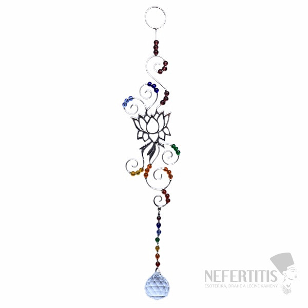 Beautifully crafted from silvery metal with the symbol of the lotus flower, colorful crystals and a cut clear ball, the charming Feng Shui crystal pendant Lotus flower brings not only the sparkling color of its crystals into the space, but also beauty, happiness and purity into your life. Lots of small colored beads symbolize the colors of the seven chakras. A 3cm large Feng Shui crystal ball made of clear cut lead glass hung at the end of the curtain symbolizes the all-embracing unity of the universe and our life, blessing and enlightenment that brings peace and experience to life. It provides peace of mind, love and joy. The lotus flower is a symbol of eternity, rebirth and spirituality. Seven crystals in the colors of the chakras harmonize and balance the energies of the most important chakras . Hang this very decorative Feng Shui curtain preferably in the window of an apartment or office and let the sun shine through it in magical and sparkling colors of the rainbow into your space. Just looking at the sparkling flashes of light will bring peace, joy and relaxation to your soul.