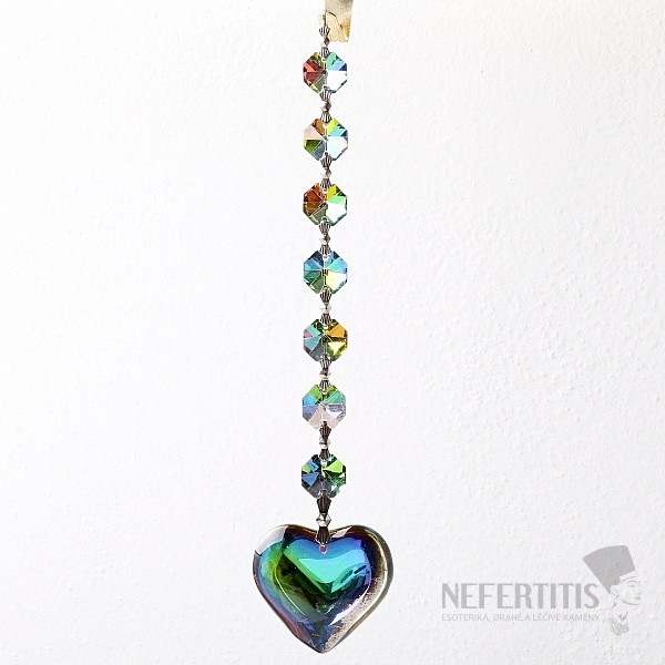 The beautiful Feng Shui crystal curtain Affection brings not only the sparkling color of its crystals into the space, but also the color of the rainbow metalized seven small octagonal crystals and also affection, warmth and a feeling of (not only) maternal care. A 4 cm large crystal heart for Feng Shui made of iridescent metallized glass, suspended at the end of the curtain, symbolizes the so-called Metta (Loving), a method of meditative concentration , which is a loving and affectionate state of mind. With this concentration, a feeling of love, warmth and care permeates you. This kind of meditation is very useful for developing all three components of the naked life path: morality, concentration and wisdom. Hang this string of crystals preferably in the window of your apartment or office and let the sun shine through them in the magical and sparkling colors of the rainbow into your space. Just looking at the sparkling flashes of light will bring peace, joy and relaxation to your soul. Let your mind be caressed by the colorful sunshine and find love and wisdom within. The Láskyplnost crystal curtain is particularly suitable for children's rooms , as it strengthens children's feelings of all-embracing love and care.