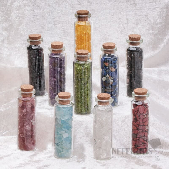Bottle with olivine - personal talisman for love, happiness and peaceful sleep. Material: glass and cork. Illustrative image. You can carry the bottle with you as a personal talisman, place it at home or on your desk… more »